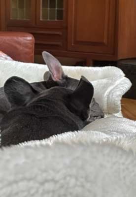 午前5時前、リビングのクッションの上にアニ☆オトを寝させて、私、ソファで寝る。