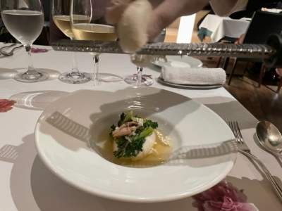 『新玉ねぎのムースと蛤 鶏のコンソメ × チーズ工房”千”の和み』