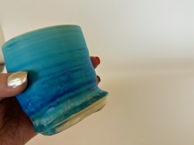 墨色の貫入の肌に滴るようなカラフルなラインが魅力のカップ