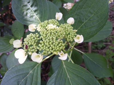 庭のガクアジサイの花が
