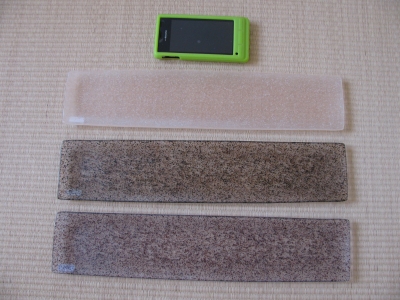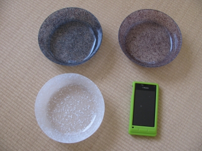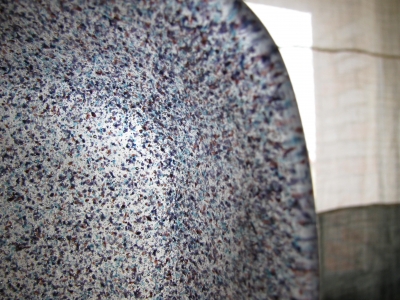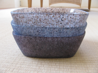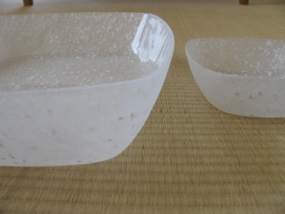 半透明な地色のガラスの中に細かい色のチップが混じった