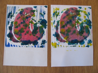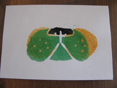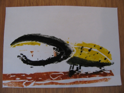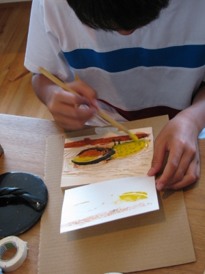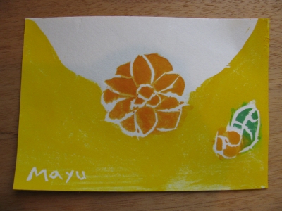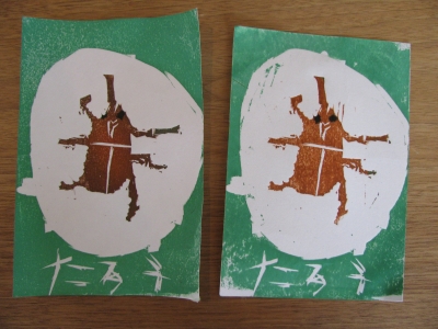 アクリルガッシュで色を付け、摺りました。