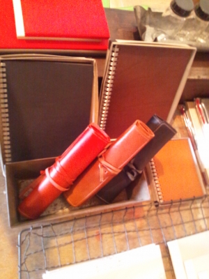 上の方に写っている革の表紙のノート。
