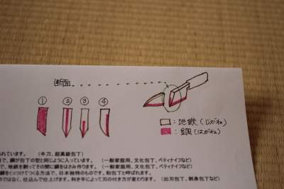 ④片刃・・・地鉄の片側に鋼をくっつけてつくる方法で、日本独特のものです。和包丁と呼ばれます。