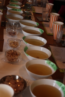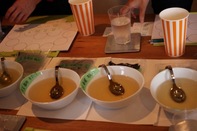 鰹節と昆布いろいろでひいた出汁のテイスティング。