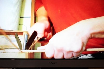 『幅取り』 ひごを二本立てた小刀の間に通し、同じ幅にそろえます。