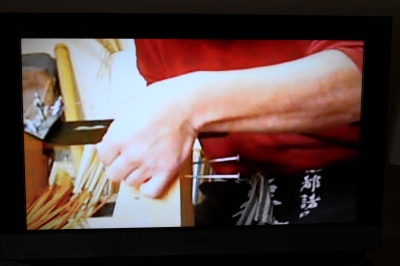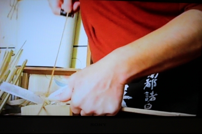 『薄剥ぎ』 ひごの厚みを“竹割包丁”を用いて薄く剥いでいきます。