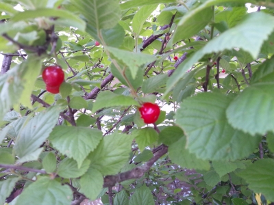 ゆすらうめも、今、直径1センチくらいの赤い実を生らせています。