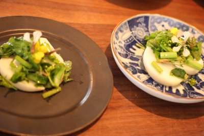 アミューズ: フルーツカブと白菜の菜花、ルッコラの花芽