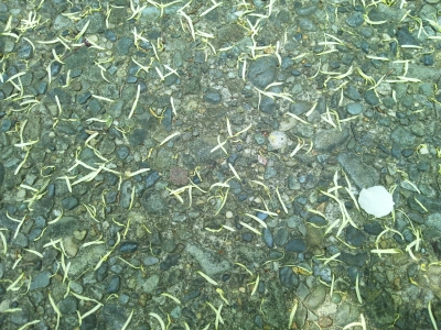 外階段にはマンサクの黄色い細長い花びらがたくさん散って、