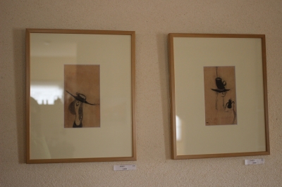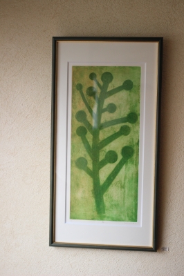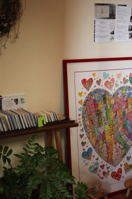 カフェの壁に掛けているさとうしのぶさんの版画。