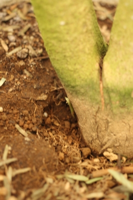 幹の根元の左側に若草色の茎が出ているコレです。