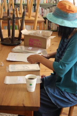 それらを三つ折りして封筒に詰めて封をする作業を