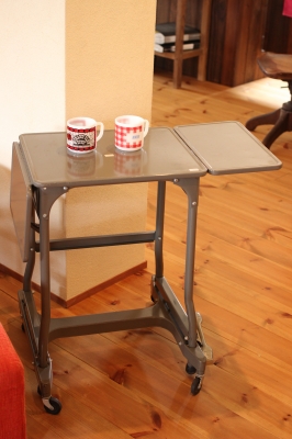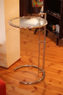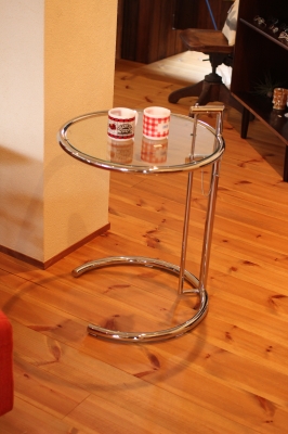 高さが変えられるガラストップのサイドテーブル。