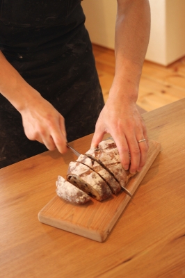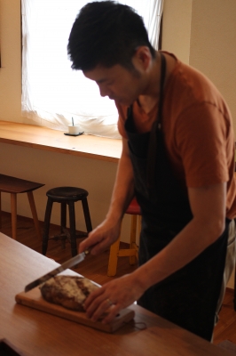 3月の受注会から届いたばかりの赤畠大徳さんのパンナイフで切れ味を試す。