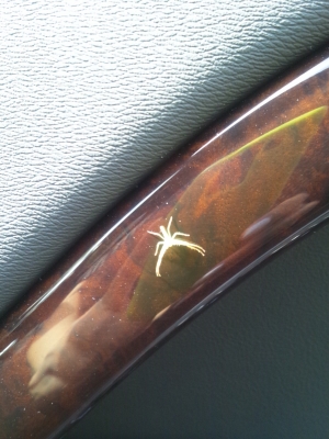 変わったカタチの綺麗な蛍光グリーンの小さいクモがいました。