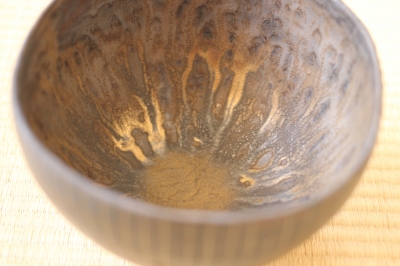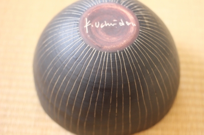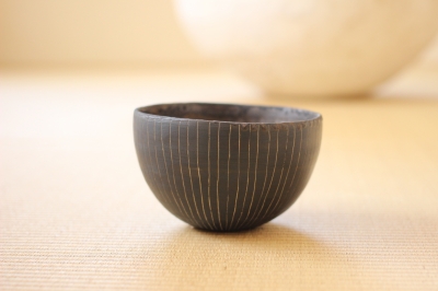 このボウルは内側がブロンズで外側が黒釉でひっかき柄。
