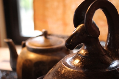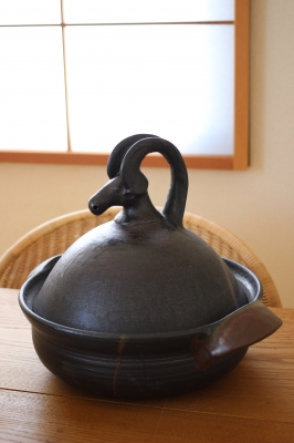 この水牛の取っ手の蓋の土鍋は、