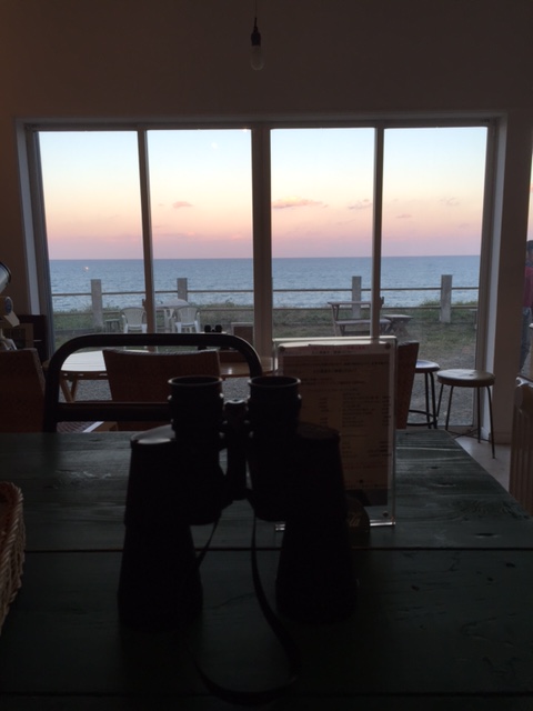 双眼鏡を覗くと、波がユラユラ、雲が流れ、水平線の向こうに大きな船。