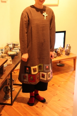 陽子さん作の陶のブローチをつける。