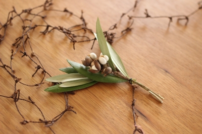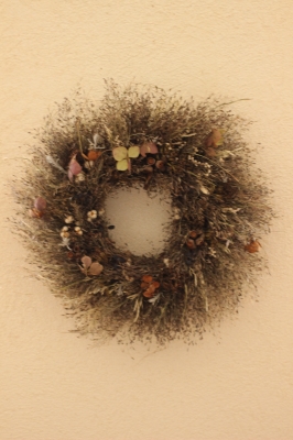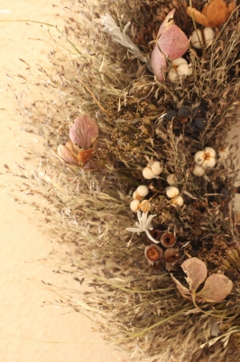 このリースを包む紙にかけられた紐や小さいブーケ、