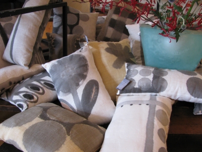 クッションの黄色いのだけは、韓国の苧麻でクチナシで染められています。