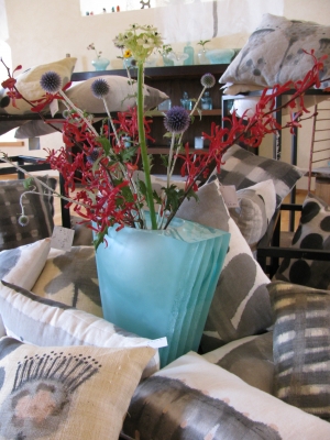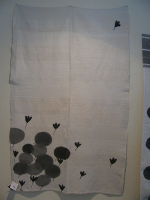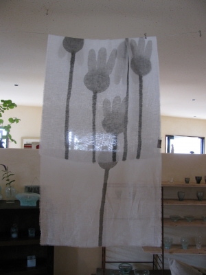 透け感のある真っ白な麻に、墨で描かれた植物のような抽象画。