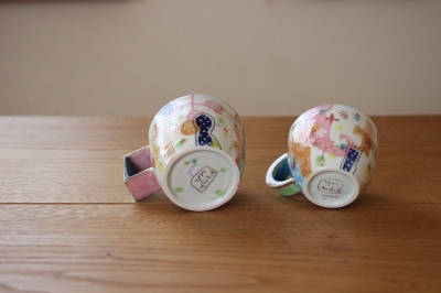 ③一番左は、半磁器でツルんとした美肌の上に鮮やかな色絵付けのもの。