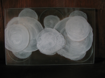 フラットに何層かになっている各々の板ガラスの白い丸が重なる。