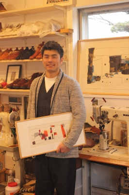 若干不自然ながらも、續山さんの版画作品がバックと手にあり。(微笑)