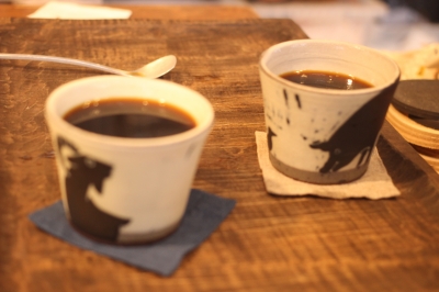 坂井千尋さんのヤギとブタくんのカップでコーヒーをいただく。
