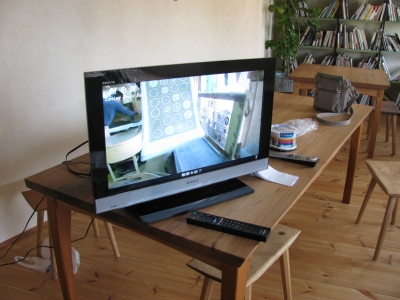 手ぬぐいを注染で染め上げていく工程のDVDを繰り返し流れるよう編集。