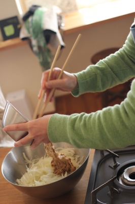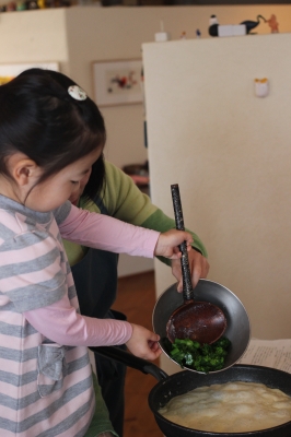 飛び入り参加のおチビちゃん、菜の花を入れる大役に挑戦。