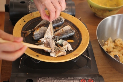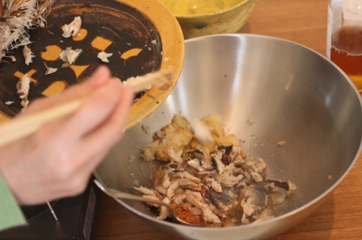 グリルしたアジの身をほぐして、