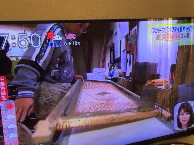“注染”の技法で手ぬぐいが染められていく過程を見せていただきました。